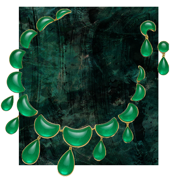Crescent cabochons and teardrop emeralds trace asymmetrical arcs, mimicking oases and moonlight paths