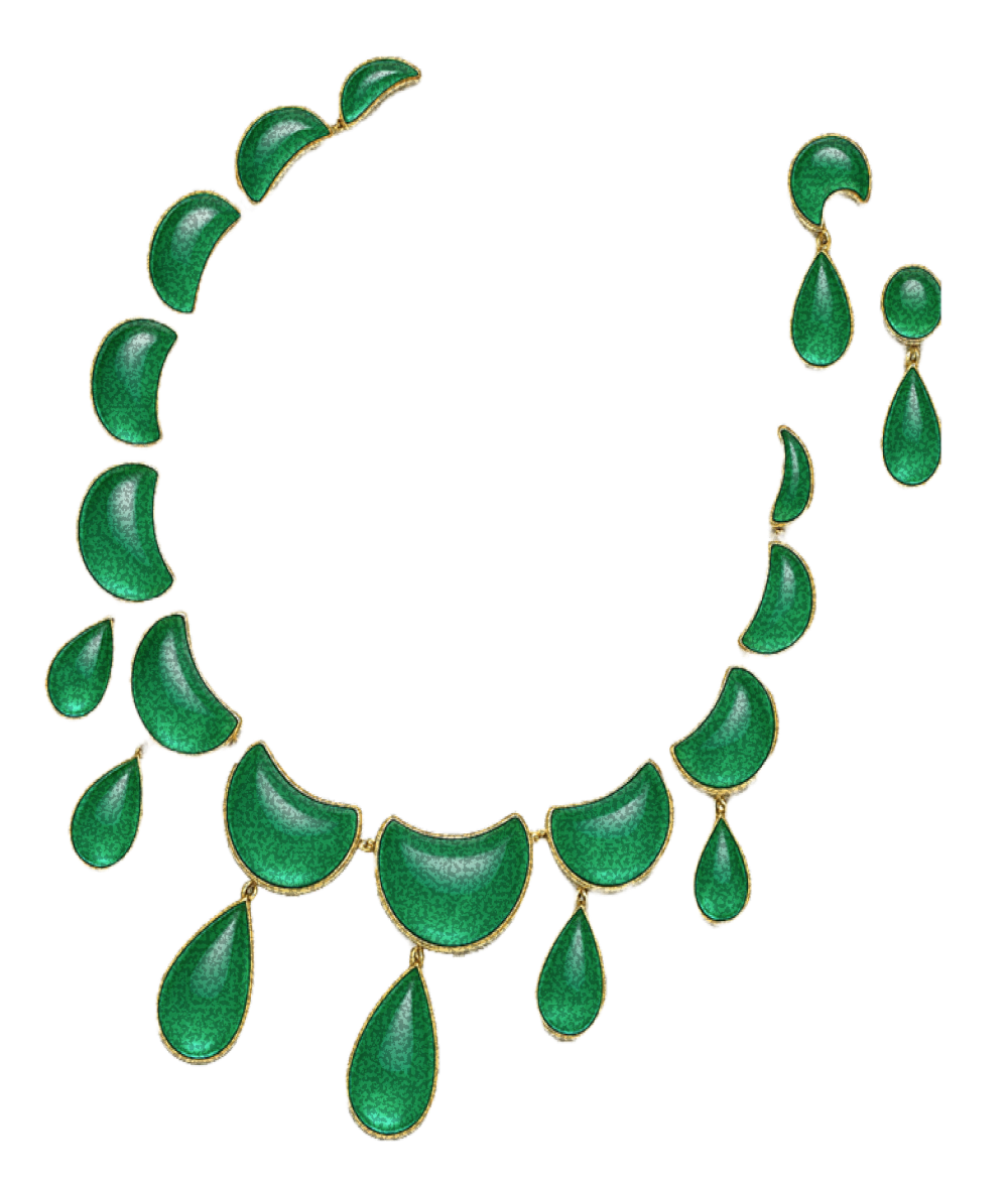 Crescent cabochon emeralds + tear-drop emeralds in graceful trails. Glossy mother-of-pearl case with soft green suede and map-lined interior