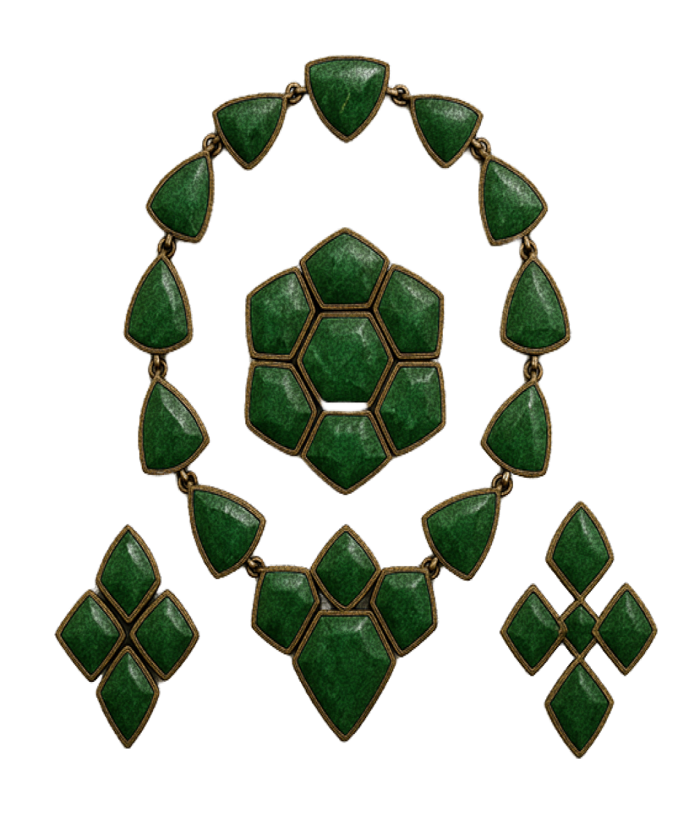 Shield-cut emeralds in dark, opaque forest greens form hexagonal and diamond motifs. Each piece is intentionally weighted, offering the balance of symmetry with the illusion of secrecy.