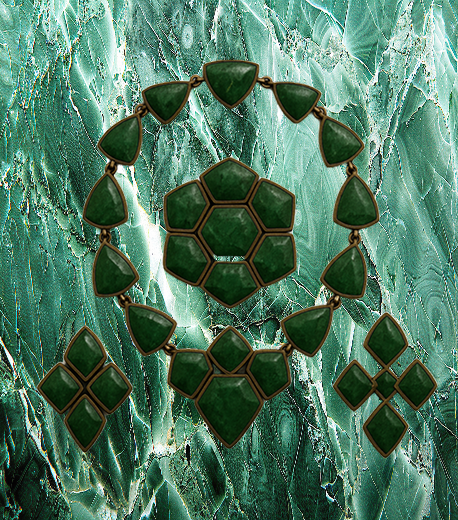 Enchanted symmetry, protective geometry, mysterious glamour. Opaque royal greens with natural matrix (like aged jade but in emerald)