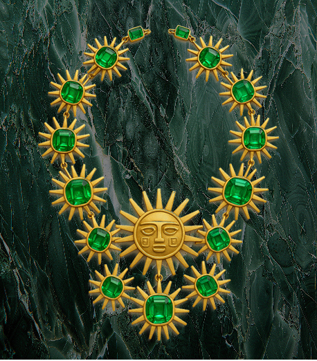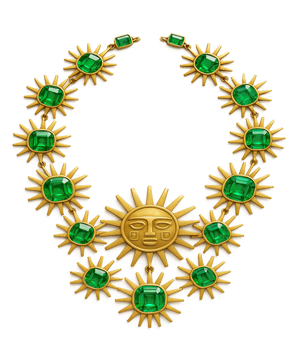Each piece is constructed with radial precision, crafted by artisans over countless hours. The emeralds are laid into a woven leather box lined with alpaca wool, and crowned with a golden sun mask — complete with an emerald third eye. It is jewelry as ritual, executed with reverence and light.