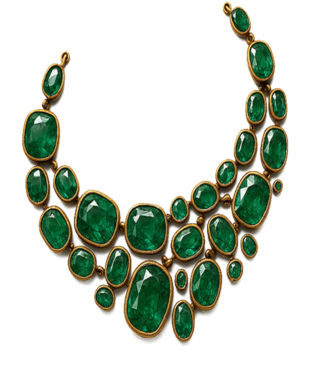 Cushion and oval-cut emeralds are arranged in asymmetrical clusters, suggesting the randomness of treasure unearthed and reimagined. The forest-green gems are richly veined, each stone distinct, evoking historical texture and layered time.