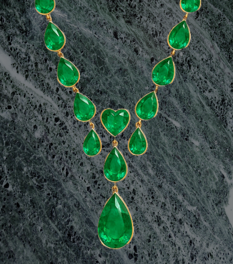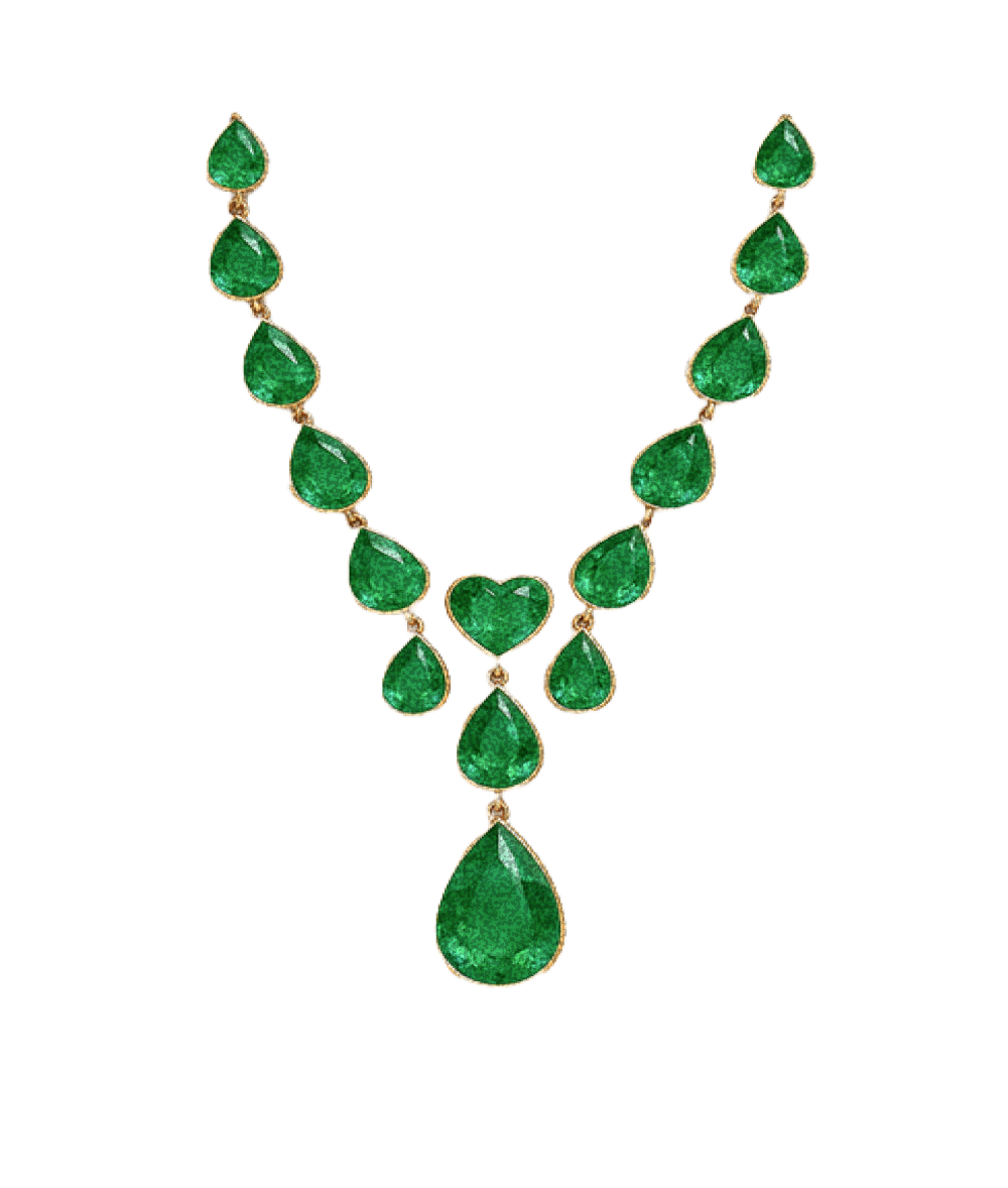 The layout features heart-shaped, drop, and pear emeralds arranged like sacred tears. The suite’s green radiance is clear and emotionally resonant — pure Colombian green that feels as raw as it is rare.
